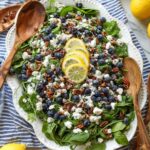 A fresh and vibrant Lemon Blueberry Salad combining baby spinach, arugula, juicy blueberries, tangy feta, and toasted pecans, all tossed in a zesty lemon poppy seed dressing that is creamy, sweet, and perfectly balanced for a delightful summer salad.