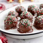Use a fork to gently lower each pecan ball into the melted chocolate, carefully rolling it around until it’s fully coated. Lift it out with the fork and set it back onto the parchment-lined tray. If you want to go festive, sprinkle holiday-themed sprinkles on top while the chocolate is still wet—the perfect finishing touch! Then, refrigerate uncovered for about 2 hours so the chocolate firms up and becomes perfectly crisp.