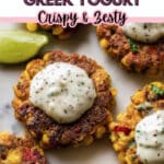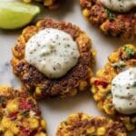 Delicious and crispy corn fritters served with a zesty jalapeño Greek yogurt sauce, perfect for a snack or appetizer. Made with fresh corn, bell peppers, cilantro, and a blend of spices, these fritters are pan-fried to golden perfection and complemented by a tangy, mildly spicy yogurt dip.