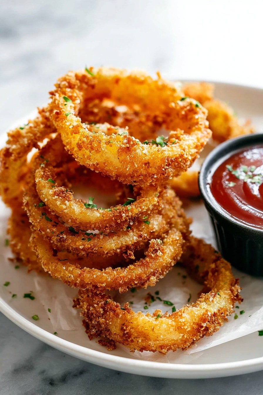 I like to sprinkle a little extra grated parmesan over the onion rings just before serving, along with a dash of chopped fresh parsley to add some color and a fresh note. A squeeze of lemon is also fantastic — it cuts through the fried richness perfectly.