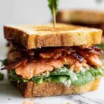 Slice your salmon into pieces that fit your bread. Spread about a tablespoon of scallion mayo on each bread slice. Layer with lettuce, salmon, tomato, crispy bacon, then top with the other slice. Slice in half for easier eating and enjoy immediately while everything’s fresh and warm.