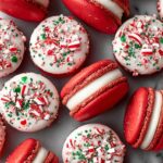 - Decorate Macaron Tops: Dip half of the cooled macarons tops into melted white chocolate, sprinkle immediately with crushed peppermint candy canes, and refrigerate to set.