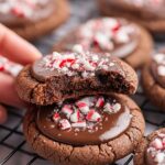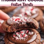 A festive Peppermint Thumbprint Cookies recipe featuring rich cocoa-flavored sugar cookie dough filled with melted chocolate almond bark and topped with crushed candy canes. These delightful cookies are perfect for holiday celebrations and easy to make using a premade sugar cookie mix.