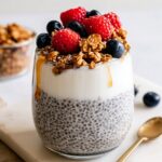 - Serve with toppings: When ready to serve, divide the chia pudding into two glasses. Layer or top each serving with ¼ cup of Greek yogurt, granola, fresh berries, and nut butter or other toppings of your choice for added texture and flavor.